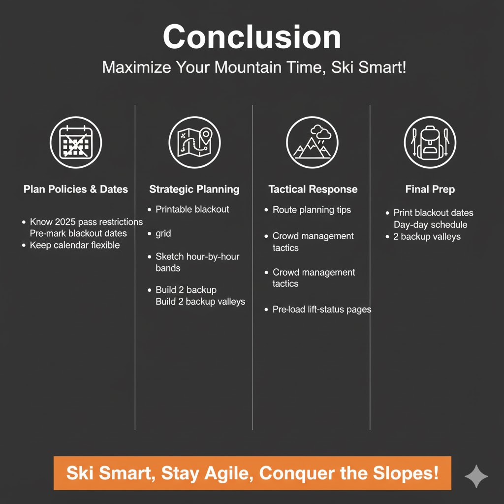 Treat 2025 like a logistics sport: know the pass policies, pre-mark your restricted travel windows, and keep your 2025 travel calendar flexible. Print the blackout dates grid, sketch a day by day schedule with hour by hour access bands, and build two backup valleys into every plan. If a storm or wind hold throws a wrench, your route planning tips and crowd management tactics will keep you moving while others refresh lift-status pages.
