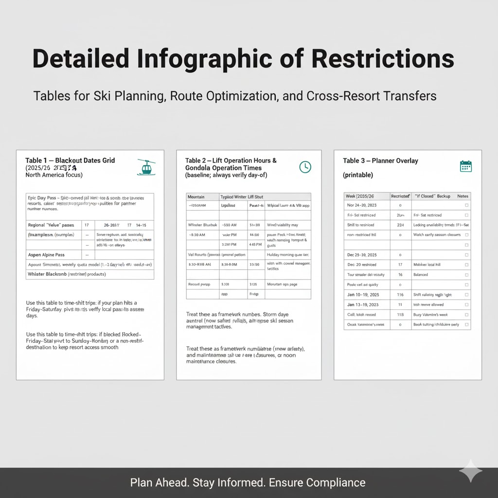 Winter 2025 is shaping up to be a busy, snow-volatile ski season—great news for powder days, tricky for planners. To keep your days smooth, we built an at-a-glance visual of seasonal bans (blackouts), day restrictions, and hour restrictions across the big multi-resort products and headline destinations, then paired it with tables you can print for your van wall. Use this as your backbone for route timing, lodging, and lift timing—whether you’re hopping valleys or stacking weekends around alpine passes events and holidays.