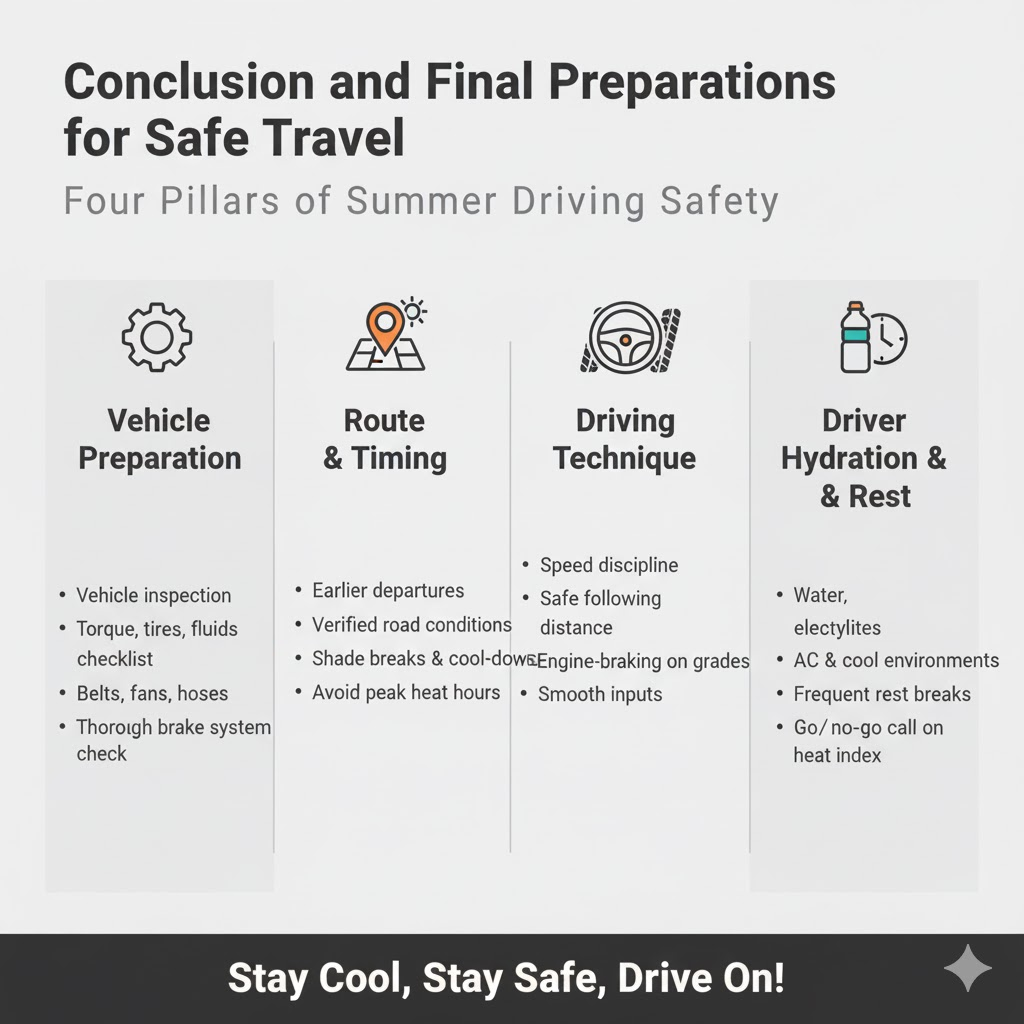 Use this list before you roll. It’s tuned for summer driving, multi-hour hauls, and urban congestion where road safety margins shrink in heat.