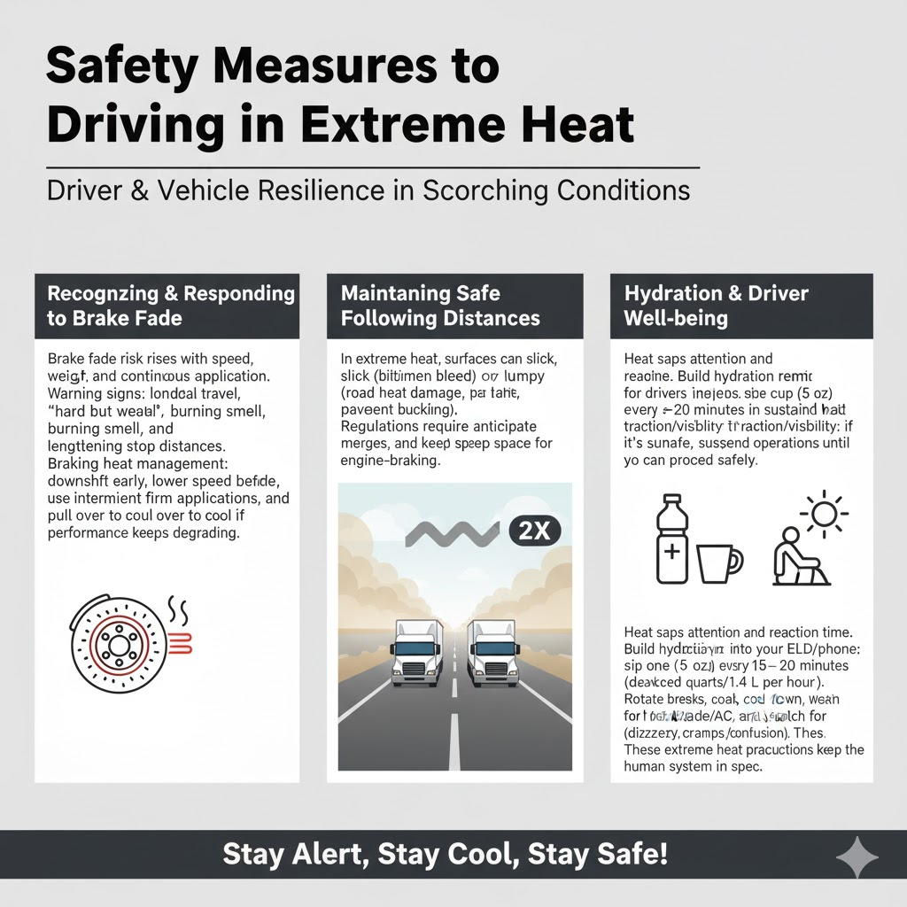 Heat saps attention and reaction time. Build hydration reminders for drivers into your ELD/phone: sip one cup (8 oz) every 15–20 minutes in sustained heat (don’t exceed ~1.5 quarts/1.4 L per hour). Rotate breaks, cool down in shade/AC, and watch for heat-illness signs (dizziness, cramps, confusion). These extreme heat precautions keep the human system in spec.