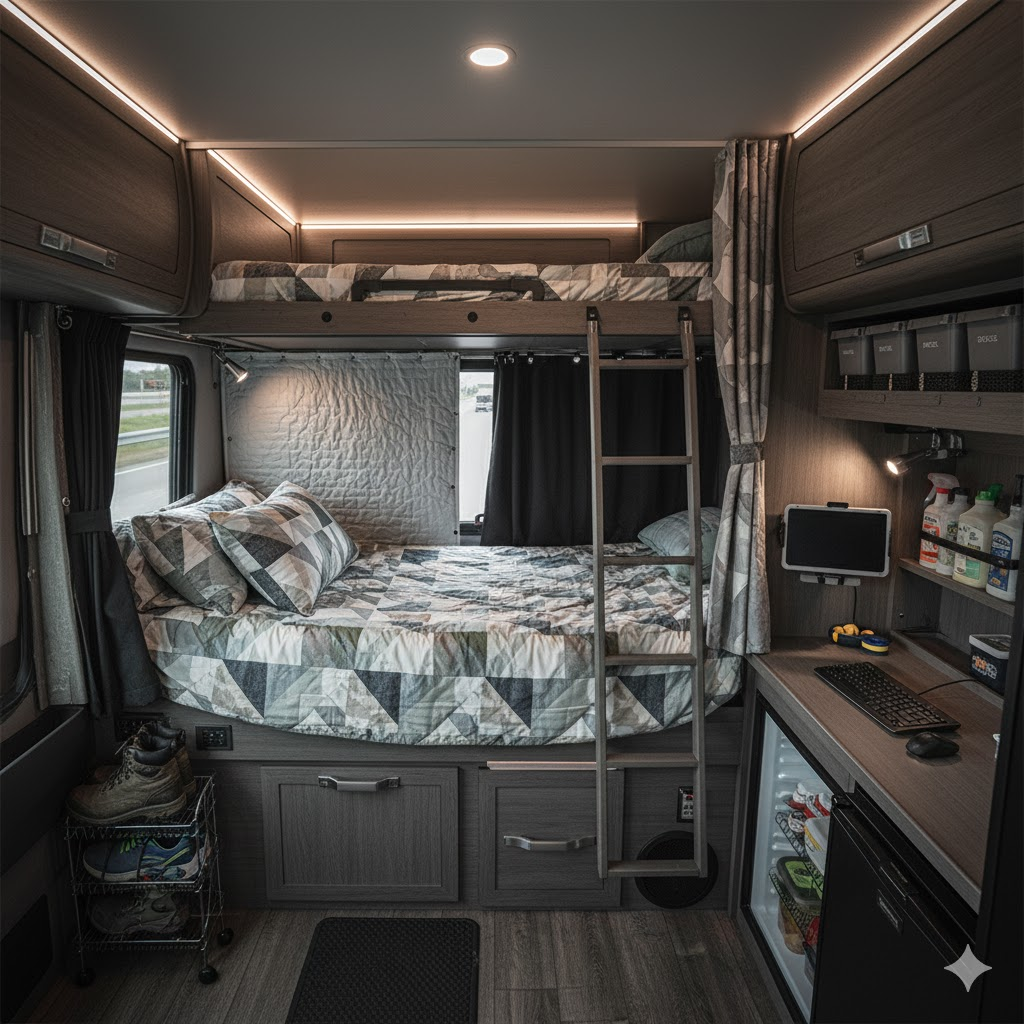 Modern sleepers can run lean or luxe, but the must-haves are simple truck amenities: a few well-placed power outlets (12-volt and AC), task lights, and places to put things where they won’t fly. Start with overhead storage for light items and a low locker for heavy gear. Add slim storage racks for shoes and cleaning supplies along the back wall, away from the swing of the fridge door. Speaking of food: make a plan for fridge space before your first grocery run; a half-stocked 12-volt unit cools more efficiently than one packed to the ceiling with uncovered containers.